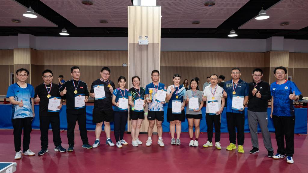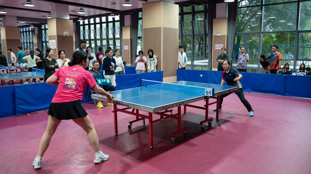 比赛设置男子单打、女子单打、男子双打、女子双打、混合双打五个项目,以团体赛形式进行。小组赛采用单循环积分赛,根据小组赛获得的积分,两组分别取前两名进入前四名排位赛。比赛现场,师生校友同台竞技,气氛热烈。教工队依托深厚功底,彰显精湛技术与稳健战术部署;学生队伍则以迅疾攻势,焕发青春一代的蓬勃活力。每到精彩对局,引得观众阵阵喝彩,充分展示出乒乓球运动的魅力。