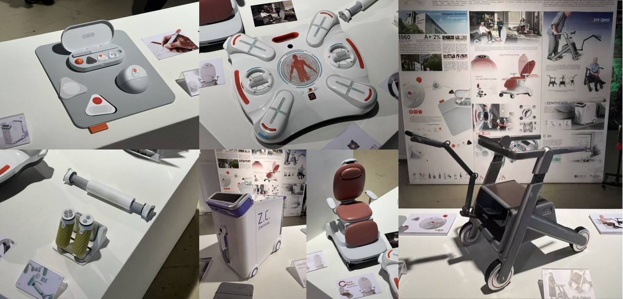 本次展览呈现了与健康福祉相关的毕业设计项目,包括为老年工作者设计的办公产品、智能机械臂助行器、兼具智能陪伴与紧急救助功能的轮椅、适老化的认知训练产品、失能老人的助浴产品、以及办公室健身交互产品。这些作品关注老年人的生理与心理照护、老年人体验设计及职场情感考量,彰显了设计的人文精神。