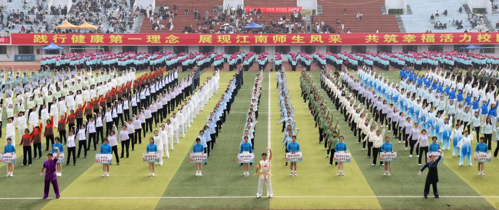 随后进行的是开幕式表演。教职工八段锦表演,起承转合间似行云流水,刚柔相济中尽显气韵生动,将中华传统体育的千年风骨娓娓道来,也诉说着江南人对文化根脉的深情守望。大型团体操《与时代共舞》将气氛推向巅峰,800名学子帽影翻飞,随乐律动,挥洒出与时代同频共舞的青春誓言。队形流转间,“WE LOVE SPORTS”字样次第呈现,个体与集体的共振,在此刻得到完美诠释。