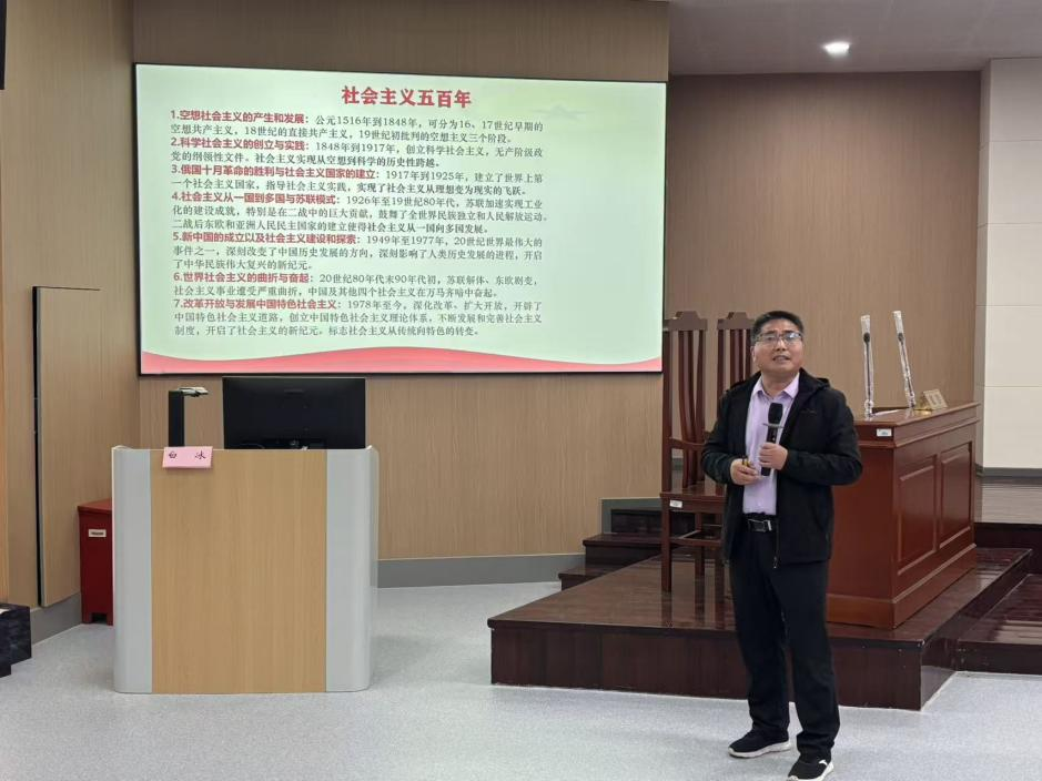 10月21日晚,全体学员共同学习观看革命历史题材影片《百团大战》。一幕幕震撼人心的场景,让同学们仿佛置身于烽火连天的战场,深刻感受到革命先辈为国家独立、民族解放所付出的巨大牺牲。10月22日,马克思主义学院副研究员白冰老师以《何以可能?中国特色社会主义的历史逻辑与文明跃迁》为题进行专题授课。他回溯“社会主义从空想到科学”的思想革命,解析社会主义成为系统化的科学理论的发展历程;通过阐述“社会主义从理论到实践”的伟大跨越,聚焦“社会主义从传统到特色”的中国探索,深入讲解中国特色社会主义如何在历史逻辑中实现文明跃迁。最后白冰寄语青年学员要在对社会主义发展脉络的清晰把握中,践行青春之力为推进中国式现代化、实现中华民族伟大复兴贡献智慧与力量。
