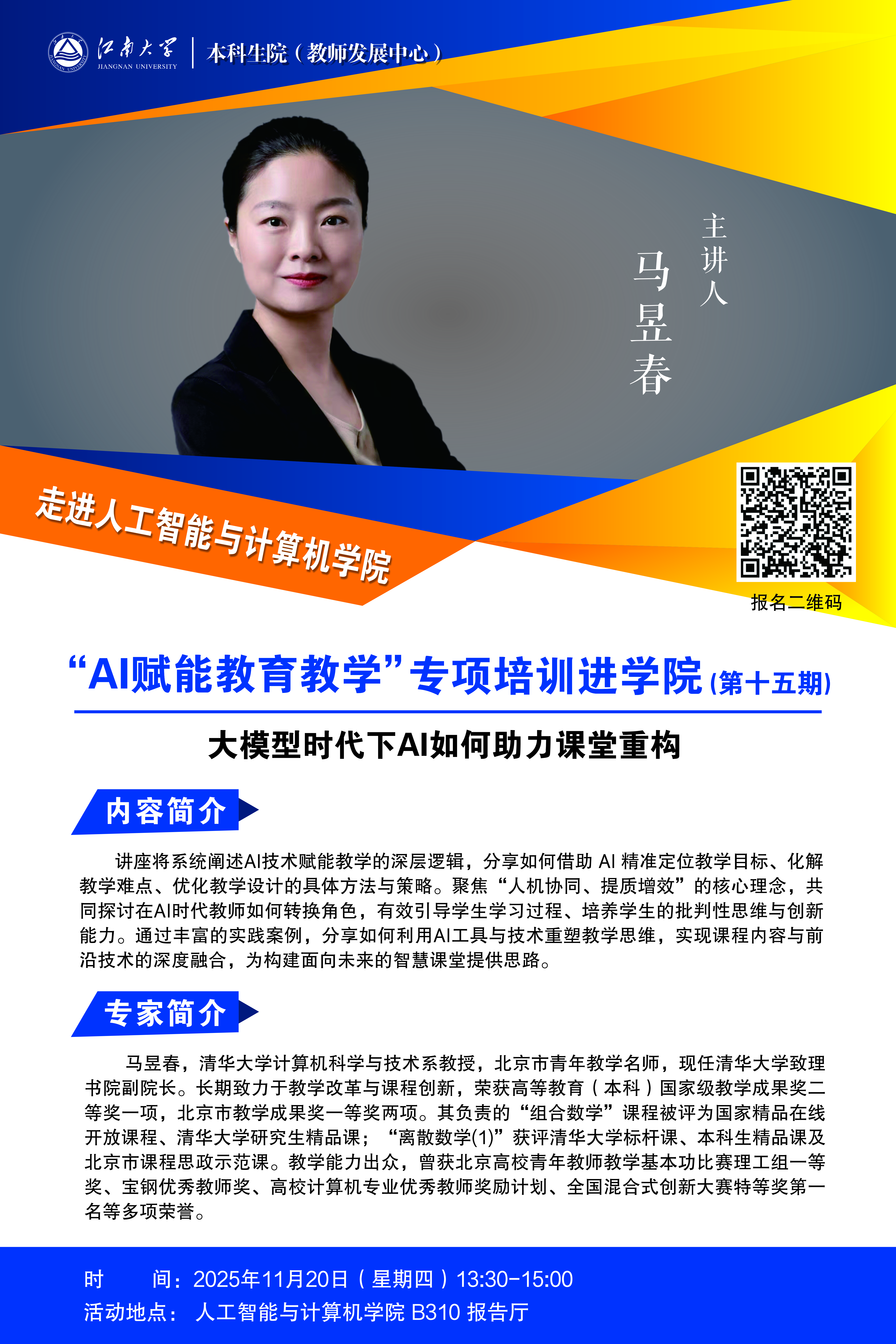 讲座将系统阐述AI技术赋能教学的深层逻辑,分享如何借助AI精准定位教学目标、化解教学难点、优化教学设计的具体方法与策略。聚焦“人机协同、提质增效”的核心理念,共同探讨在AI时代教师如何转换角色,有效引导学生学习过程、培养学生的批判性思维与创新能力。通过丰富的实践案例,分享如何利用AI工具与技术重塑教学思维,实现课程内容与前沿技术的深度融合,为构建面向未来的智慧课堂提供思路。