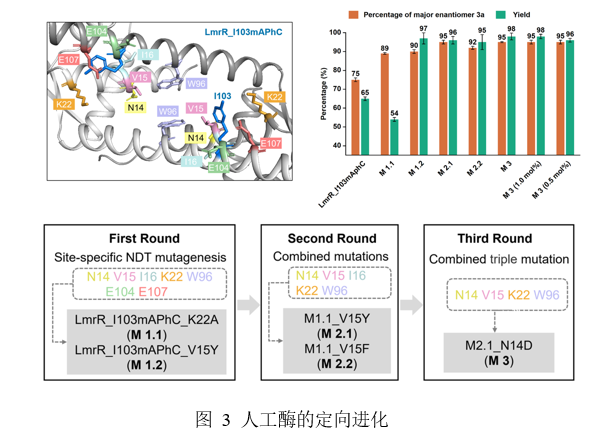基于初步成果,团队开启定向进化以提升人工酶性能。首先筛选LmrR蛋白疏水腔内19个朝向活性位点口袋的位置,构建mAPhC突变体库,发现LmrR_I103mAPhC表现出75:25 er,65%的产率。随后通过丙氨酸扫描系统识别关键氨基酸,锁定7个关键位置(14-16、22、96、104和107),并利用NDT密码子随机生成密码子库进行突变优化。经多轮筛选与组合突变,成功获得系列高性能突变体:第一轮筛选出高选择性的LmrR_I103-mAPhC_K22A(M1.1)与LmrR_I103mAPhC_V15Y(M1.2);进一步组合得到双突变体M1.1_V15Y(M2.1),其对映选择性达95:5 er;最终通过与N14D组合,获得最优三重突变体M2.1_N14D(M3),其对映选择性高达95:5 er,产率亦有显著提升。
