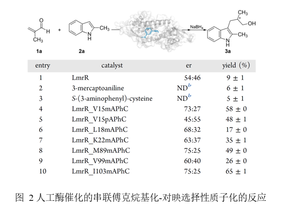 基于三质粒体系成功获得目标人工酶后,为验证人工酶的催化潜力,研究团队考察了一例具有一定挑战性的非天然不对称质子化反应。酶催化实验以人工酶LmrR_V15mAPhC为催化剂,以5 mM 2-甲基丙烯醛(1a)和1 mM 2-甲基吲哚(2a)为模型底物进行考察,初始反应获得73:27的er及58%产率。对比实验显示,无mAPhC残基的野生型酶(LmrR_WT)仅以54:46的er及9%的产率生成目标产物,mAPhC或间氨基苯硫酚作为催化剂时则无对映选择性且转化率<6%,证明了人工酶LmrR_mAPhC在此不对称质子化反应中对质子转移的重要调控作用。
