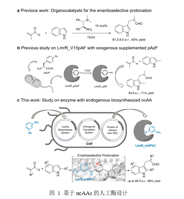 此研究通过将非天然氨基酸原位生物合成与遗传整合相结合,为人工酶设计提供了更直接、经济的新路径。相较于以往通过直接添加ncAAs的方法,摒弃了传统依赖外部化学合成的路径,显著简化了酶的设计流程。通过将ncAAs精准引入酶的活性位点,显著提升了酶的催化效率,并实现了质子化步骤的高对映选择性调控。本研究结果为非天然氨基酸在拓展人工酶催化多样性方面的潜力提供了有效策略,同时为开发酶催化非天然反应提供了可选择的技术路径。