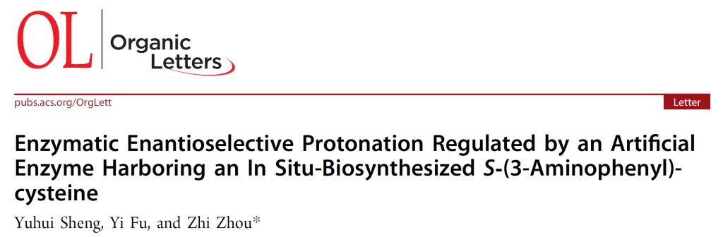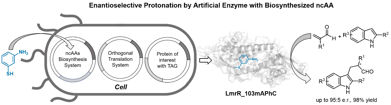 近日,江南大学周志教授课题组在化学期刊Organic Letters上发表了题为“Enzymatic Enantioselective Protonation Regulated by an Artiffcial Enzyme Harboring an In Situ-Biosynthesized S‑(3-Aminophenyl)-cysteine”的研究论文。该研究通过引入原位生物合成非天然氨基酸成功构建一类新型人工酶,该酶可高效催化一例非天然的傅克烷基化-不对称质子化反应。通过结合理性设计与定向进化,获得的优势突变体对该不对称质子化反应表现出较好的催化活性与对映选择性。该系统彰显了通过集合非天然氨基酸生物合成与引入的策略在新功能人工酶创制中的重要能力,为拓展人工酶催化多样性边界、实现非天然反应提供了有效的方法。