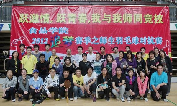 4月18日下午,食品学院2012追梦赛季之师生羽毛球对抗赛在校体育馆拉开战幕!本次对抗赛由食品学院工会和分团委联合主办,以“跃激情,跃青春,我与我师同竞技”为主题,旨在通过体育竞技加强师生交流互动,弘扬体育精神,倡导学院和谐氛围。学院共有22位教师、22名本研学生共同参加了比赛,副校长金征宇教授也作为教师代表参加了比赛。