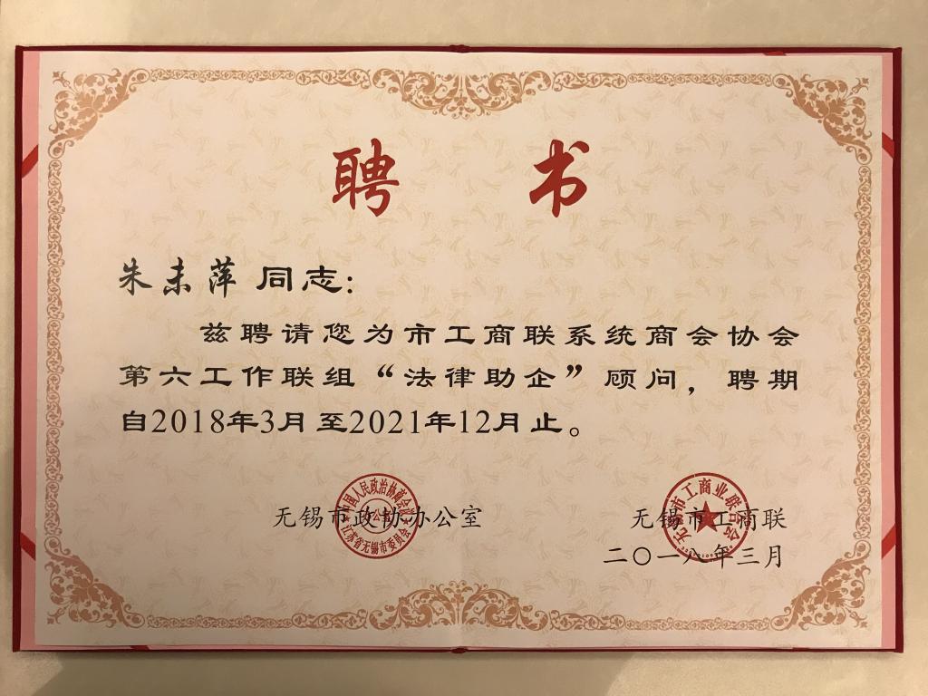 建立法律顾问制度,是党的十八届三中、四中全会作出的重大决策部署,是推进国家治理体系和治理能力现代化的重要举措。此次受聘,是朱未萍委员继担任无锡市政协法律事务咨询组成员后的又一次受聘,将更好地发挥其法务专长和参政议政的界别作用,主动提供立法协商、议政建言和法律咨询服务,积极助推无锡亲清新型政商关系和商会建设,践行“立足本职促发展,当好委员献良策”的政协委员职责,进一步体现高校教师为地方服务的智库作用。