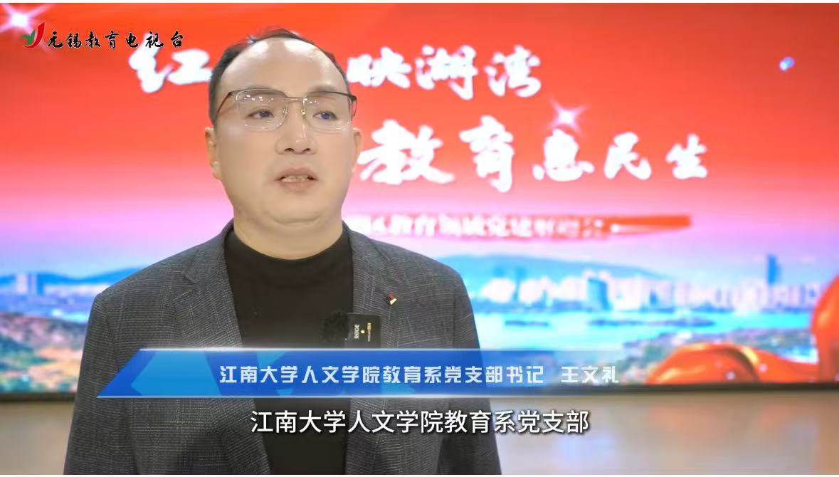 王文礼接受无锡市教育电视台采访,他表示人文学院教育系党支部充分发挥学科优势、师资力量及党建经验,与无锡市滨湖区七所学校开展党组织共建,通过党建引领、资源共享、专业赋能,实现党建引领“一融双高”,推动党建与教育教学、科研创新深度融合,形成“1+7+N”的可持续合作范式。