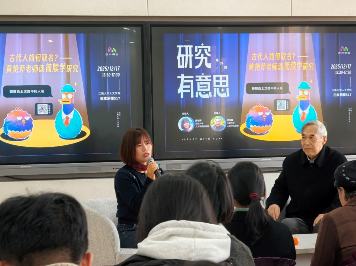 本期江南大学艺术课堂《研究有意思》第九期《古代人如何取名?》圆满落幕,它使2000多年前的社会生活画面生动地展示在听众面前。既有历史的回顾,又有活泼泼的知识传授。徐兴海以贯通文史的视野与丰富的教学经验,引领听众了解汉简人名的特点,揭示命名文化背后鲜活的时代图景。黄艳萍则以熟稔的文献功底和亲切的叙述,梳理简牍中丰富的社会生活记载,展现学术研究从发现到追问的思维路径。这场融合文献实证与人文关怀的对话,不仅深化了师生对简牍学多维价值的认识,更启发大家在传统与当代之间,探寻学术与自我成长的生动链接。