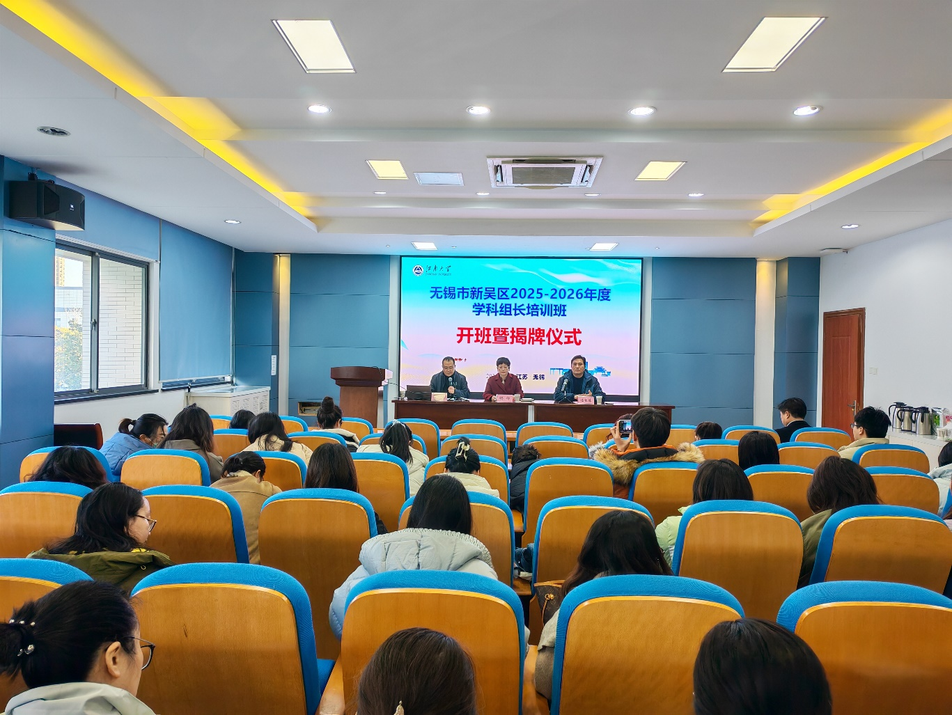 为进一步全面落实“四精四有”精神,无锡市新吴区教育局精心策划了面向全区中小学语文、数学、英语三大学科110余名组长的专题培训,并于12月26日上午在江南大学人文学院举行开班仪式。无锡高新区党工委(新吴区委)教育工委书记、教育局党委书记、局长杨柳,新吴区教育局组织人事处处长万杰及江南大学人文学院、教育学院院长伍红林教授出席开班仪式。仪式由新吴区教师发展中心副主任丁强主持。