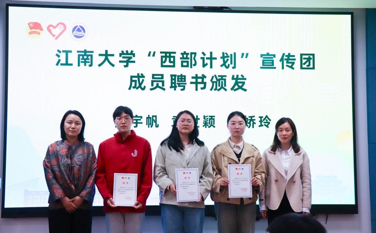 报告环节结束后,王园园、徐璐为张宇帆、袁世颖和朱娇玲颁发江南大学“西部计划”宣讲团成员聘书。