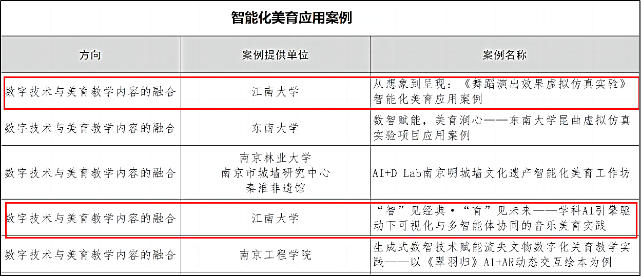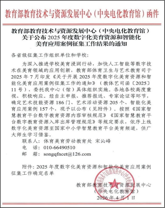 近日,教育部教育技术与资源发展中心(中央电化教育馆)公布2025年度数字化美育资源和智能化美育应用案例征集工作结果,学院孙丝丝教授团队的《“智鉴经典·育见未来”——学科AI引擎驱动下可视化与多智能体协同的音乐美育实践》、侯侠老师团队的《从想象到呈现:<舞蹈演出效果虚拟仿真实验>智能化美育应用案例》入选智能化美育应用案例。