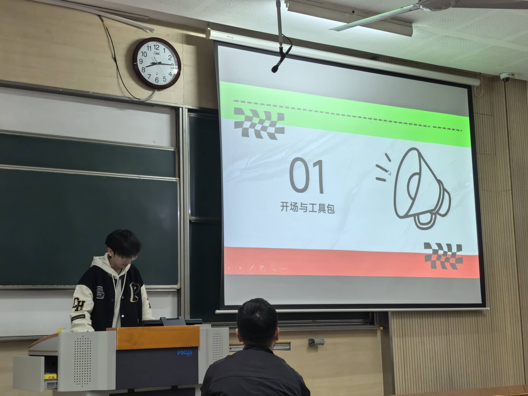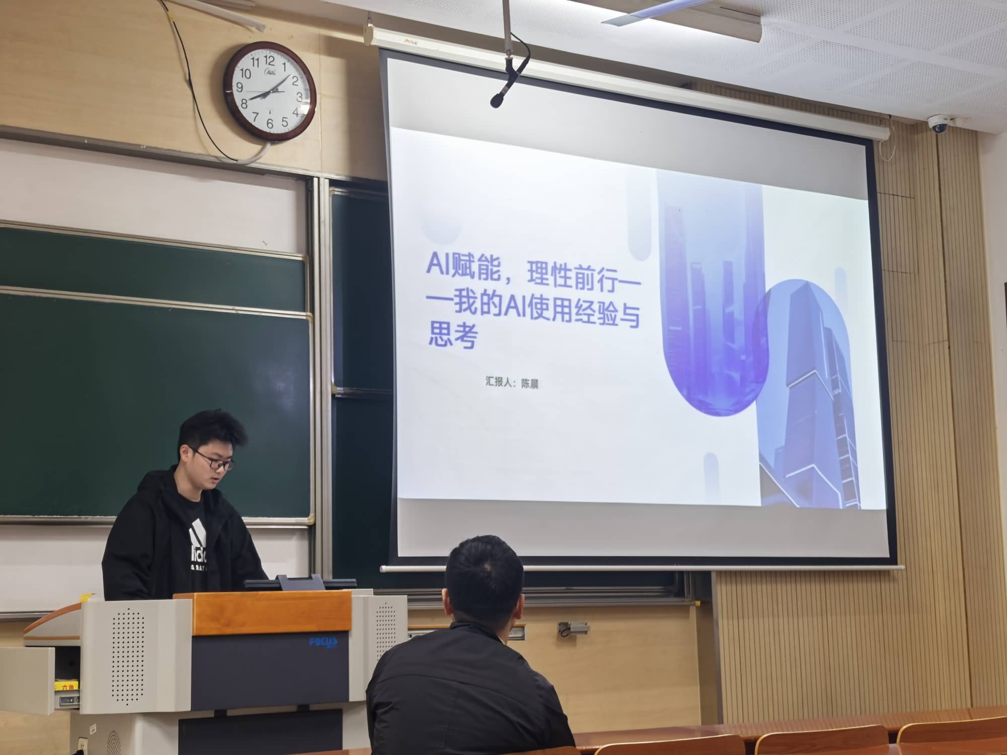 活动现场,三位光科 2404 班学生代表结合自身实践,分享了 AI 工具的应用心得。吴俊濠同学以大创项目数据处理经历为切入点,详细介绍了 AI 在数据分析与文献阅读中的具体应用场景,强调根据任务特性选择适配平台是发挥 AI 优势、提升问题解决效率的关键。陈晨同学聚焦学科竞赛,以数学建模、“蓝桥杯”备赛为例,阐述了 AI 技术在辅助解题、优化备赛流程中的积极作用,同时明确指出“学生应始终占据主体地位,AI 仅为辅助工具,真正的决策者与责任主体永远是人”。方海亮同学则从日常学习需求出发,梳理了主流 AI 工具的核心特点,具体讲解了其在理解复杂概念、辅助完成课后作业等方面的实用价值,充分展现了AI作为学习助手的应用潜力。