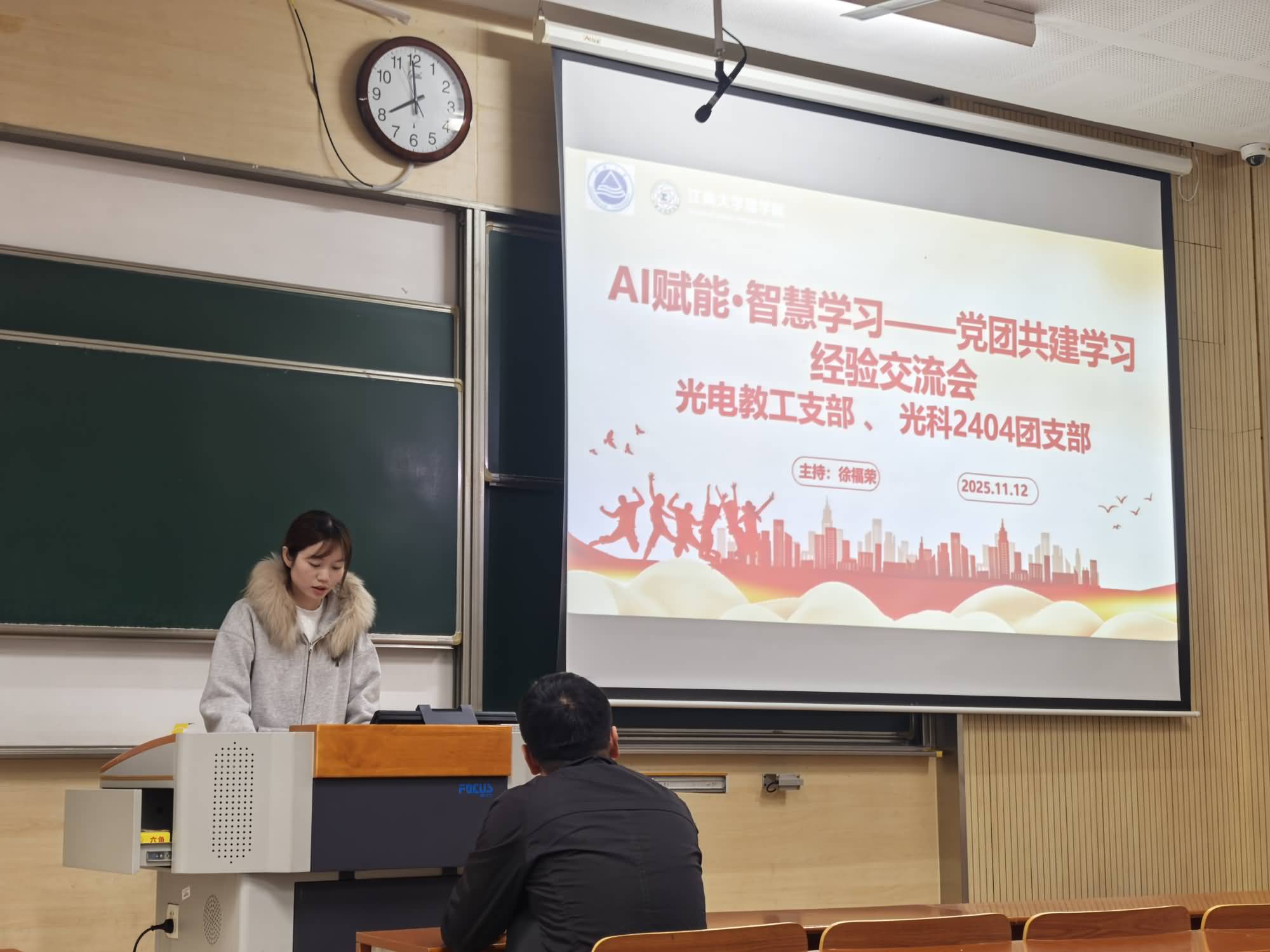 11月12日上午,光电信息科学与工程系教工党支部与光科2404团支部在第一教学楼1A106教室联合举办“AI赋能·智慧学习”党团共建活动。本次活动创新采用“学生分享+教师示范”双向互动模式,旨在引导学生科学认识 AI 工具,掌握其在学习、科研中的合理运用方法。光电教工党支部书记胡征达与光科2404班全体同学共同参与活动,活动由班级团支书徐福荣主持。