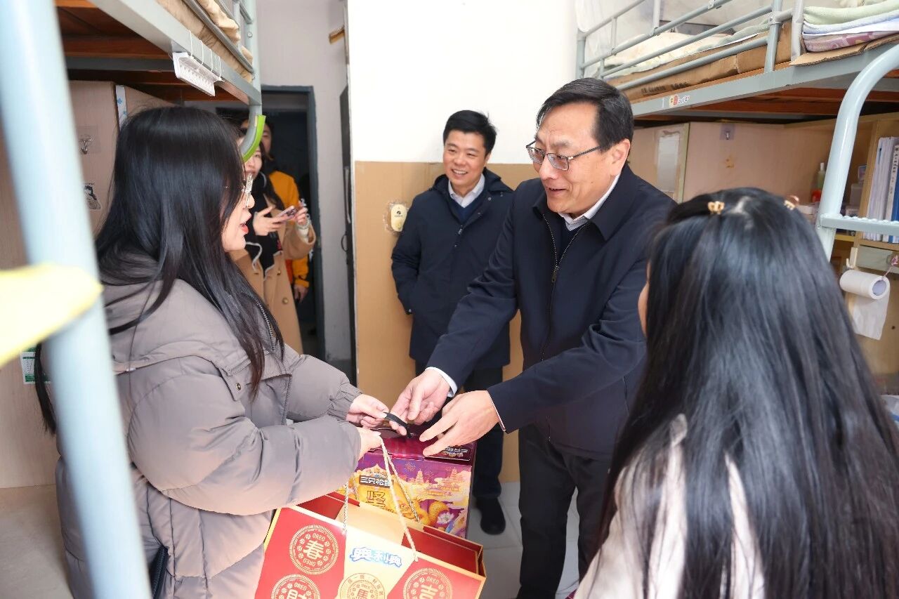 2月14日上午,校党委书记吴正国与职能部门及学院领导走访学生宿舍,亲切慰问留校学子。师长们暖心关怀留校过年的学生,询问同学们的生活日常、实际需求,鼓励他们充分利用寒假时间,勤学习、多思考,确保度过一个平安充实的寒假。校领导还为留校学子送上新春暖心大礼包,让同学们感受到浓浓的年味以及家的温暖。