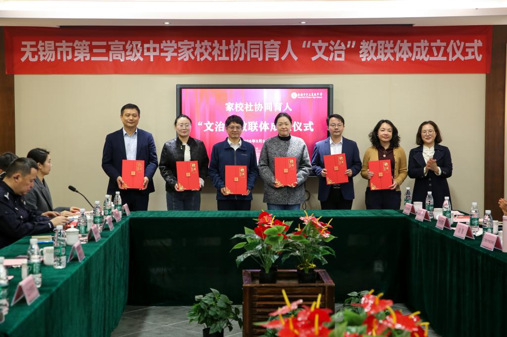 无锡市第三高级中学副校长赵莹宣读“文治”教联体成员单位名单,学校党委书记刘丽平为各成员单位颁发聘书。来自高校、街道、医院、企业、场馆等22家成员单位代表共同见证教联体正式启航。