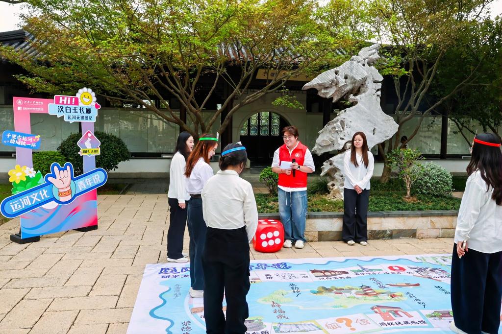 活动结合运河沿线的民族工商业遗址与无锡历史地标,设计了寓教于棋的运河文化大富翁游戏。棋盘以运河沿线工商脉络为底图,将九丰面粉厂、储业公所旧址、清名桥等核心地标清晰呈现。研学学生戴棋子帽沿商路前行,在掷骰博弈间,把运河工商史和锡商精神内化于心。同时,活动设计了踢毽子、投壶、同心鼓等团体活动,帮助研学同学在欢笑中快速熟络。