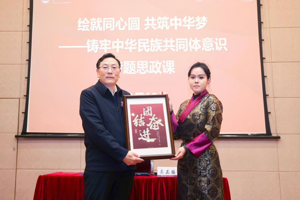 学生代表向吴正国赠送融合了壮族、维吾尔族、蒙古族、藏族等多民族语言元素的民族书法作品,表达对铸牢中华民族共同体意识的深刻理解,彰显代代江南人不断进取的精神底色。