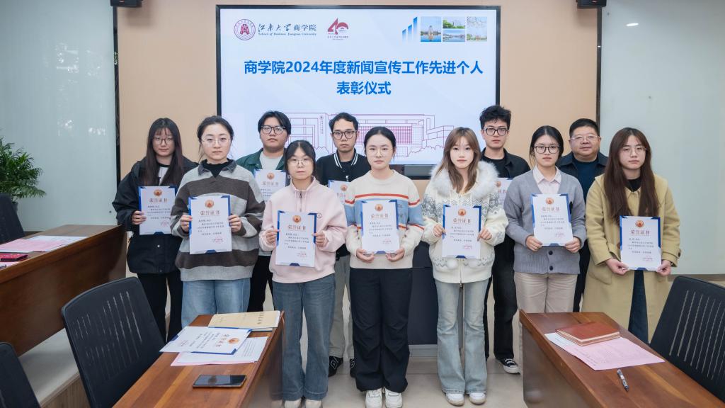 会上,刘长青为商学院2024年度新闻宣传工作优秀工作者和先进个人颁发荣誉证书,鼓励和表彰过去一年在学院新闻宣传工作中表现突出的教工通讯员和学生骨干。