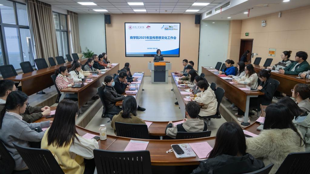 11月13日,商学院2025年宣传思想文化工作会议在学院116会议室召开。商学院党委书记刘长青、副院长王雷、师生通讯员以及新媒体工作室学生骨干共计40余人参加会议。会议由学院专职组织员钱明霞主持。