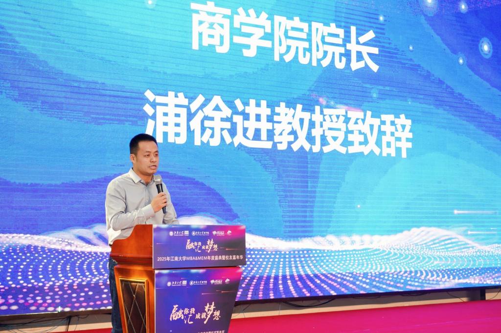 活动现场,浦徐进在致辞中回顾了商学院的育人初心,介绍了MBA、MEM、MPAcc三个研究生项目的发展历程和国际认证成果,并向师生校友们提出三点期望:一是秉持院训、不断提升,二是支持学院、贡献智慧,三是加强合作、携手共赢。