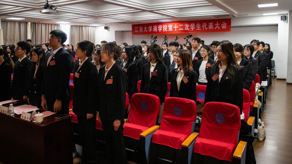 闭幕式上,江南大学商学院全体代表通过了大会决议,并向学院本科生、研究生发出倡议。大会号召广大青年学子要筑牢思想根基,强化引领效能,夯实组织基础,聚焦服务核心,为实现中华民族伟大复兴的中国梦贡献青春力量。最后,在嘹亮的《国际歌》声和热烈的掌声中,江南大学商学院第十二次学生代表大会、第五次研究生代表大会闭幕。