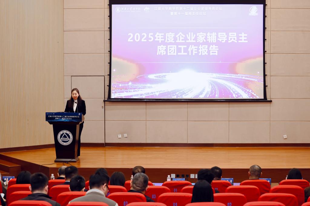 张君君作2025年度企业家辅导员主席团工作报告。她通过详实的数据和具体的成果,全面展现了企业家辅导员团队在过去一年中的倾情付出与责任担当,清晰呈现了校企协同育人的广阔前景与实践价值。