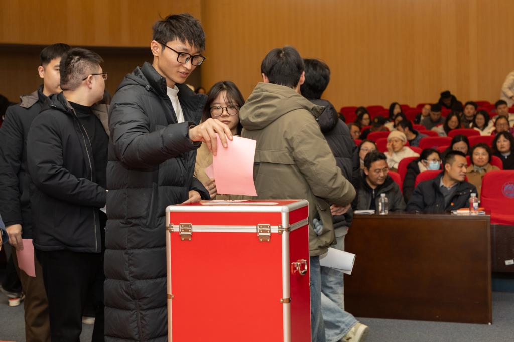 1月7日下午,商学院在远东报告厅召开党委换届选举大会,选举产生新一届党委委员,全院师生党员参加大会。会议由院党委副书记兼副院长郑丹丹主持。