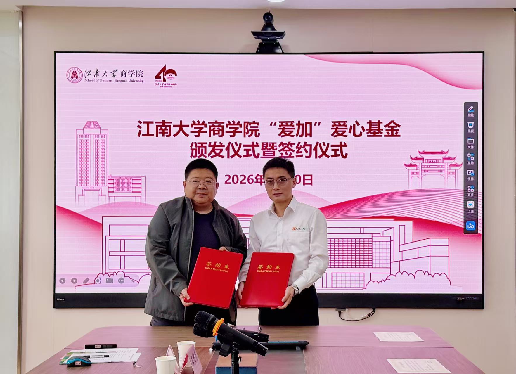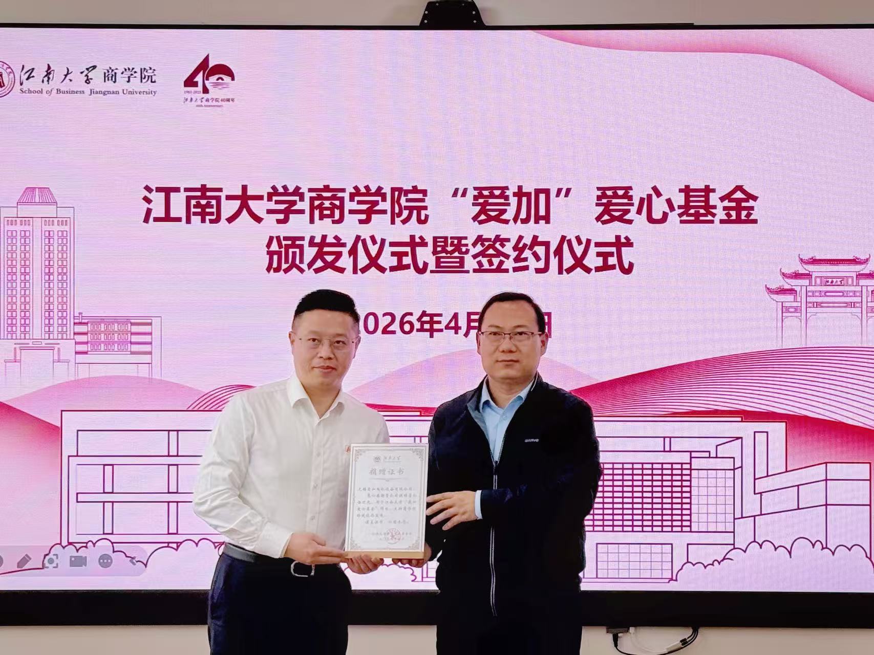 4月20日下午,“爱加”爱心基金颁发暨续签仪式在商学院304会议室举办。商学院99级校友、无锡爱加电机设备有限公司总经理陈兵,运营总监江舟,行政经理蔡奕铭;江南大学对外合作与市校共建处副处长任增亮,商学院党委书记刘长青,党委副书记兼副院长郑丹丹,以及学院辅导员代表、11名获助学生共同参加活动。仪式由郑丹丹主持。