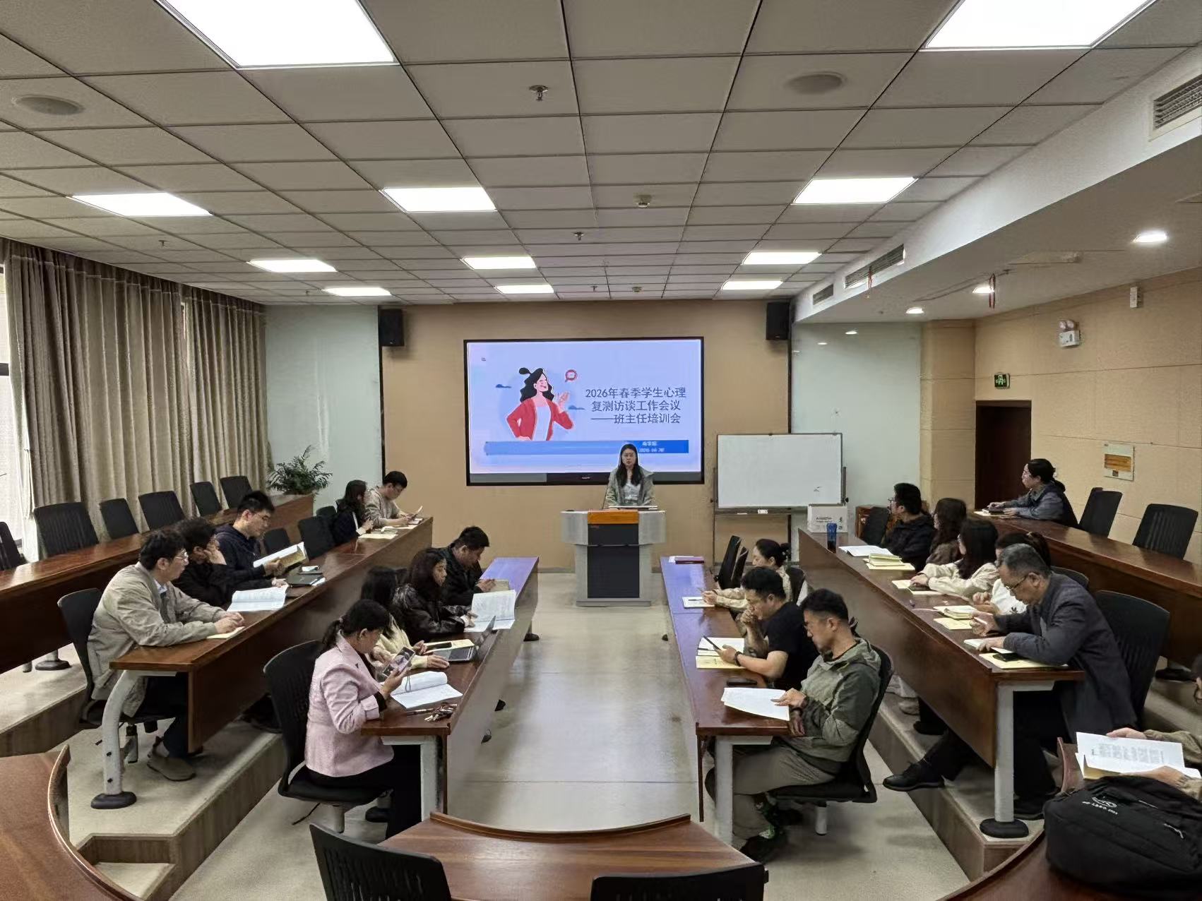 田雨结合本科2023级、2024级学生特点,向班主任作近期心理工作提示,并围绕谈心谈话技巧、风险识别与心理关爱等内容开展专题培训。同时,她详细阐述了班主任在学生心理支持工作中的角色定位与操作规范,提醒各位班主任在日常工作中注重人文关怀,走进课堂、走进宿舍,聚焦学生心理需求与成长规律,切实守护学生健康成长。