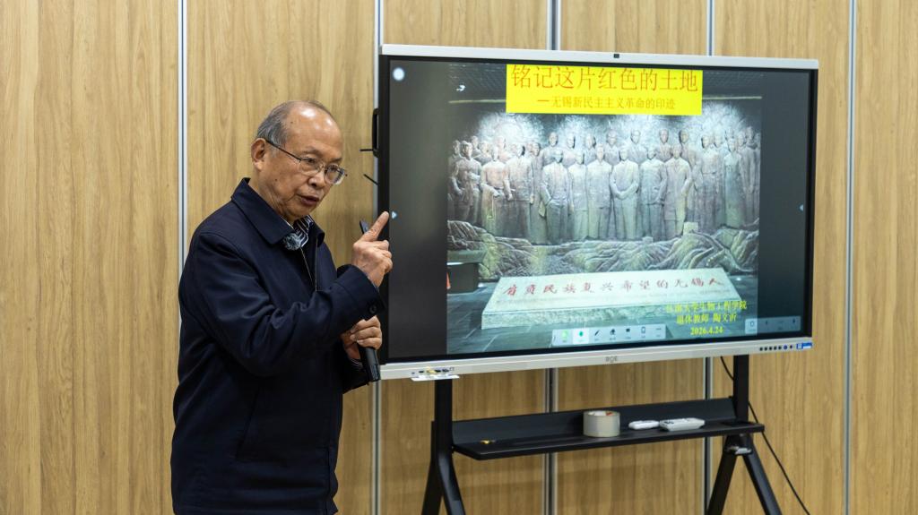 主题党课环节,陶文沂以《铭记这块红色的土地——无锡新民主主义革命的印迹》为题,带领师生系统回顾无锡红色历程。他讲到,1919年五四运动后,革命思想在锡城广泛传播,进步青年觉醒,红色火种悄然萌芽;大革命与土地革命时期,无锡党组织建立,工农运动兴起,革命力量在艰苦环境中不断壮大;全面抗战时期,无锡籍革命志士与本地党员群众坚持抗日救亡、敌后斗争,用热血守护家园;解放战争后期,革命浪潮席卷而来,1949年4月23日无锡宣告解放,城市历史翻开崭新篇章。陶文沂勉励全体党员铭记革命历史、传承红色基因,肩负起民族复兴的重任,向无锡革命英雄学习,把爱国情、强国志转化为青春行动。