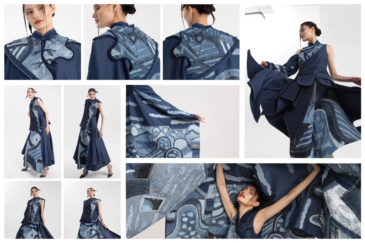 本次获奖作品正是该工作室在跨媒介、可持续设计方向上的一次有力实践:作品汲取民居建筑的空间意象与牛仔服饰的材质语言,以再生设计策略打通传统文化谱系与现代牛仔面料的转译路径,在传承与创新、地域性与国际化之间建立有机关联,呈现出兼具文化深度与时代审美的时尚表达。