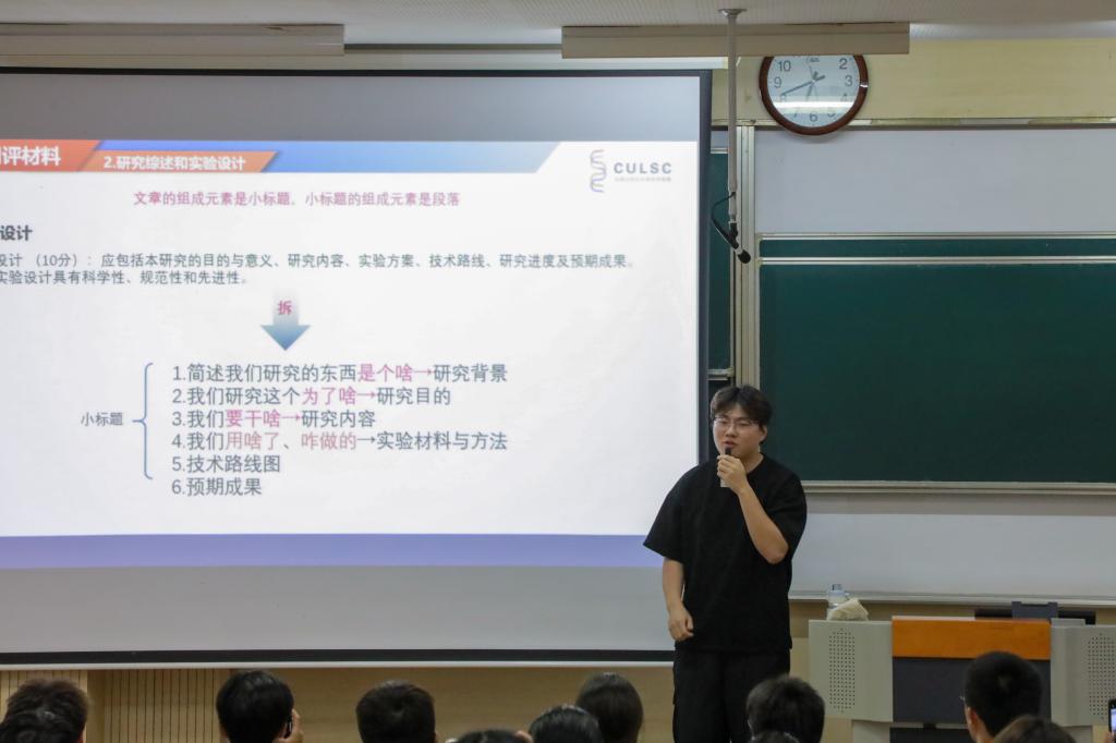 会上,第十届全国大学生生命科学竞赛(科学探究类)国家级一等奖获得者杨博宁首先作经验交流。他围绕参赛目的、赛前准备、赛事推进与赛后总结四个方面系统介绍了参赛历程,并针对实验报告撰写和PPT制作等关键环节提出具体建议,为拟参赛同学提供了实用参考。
