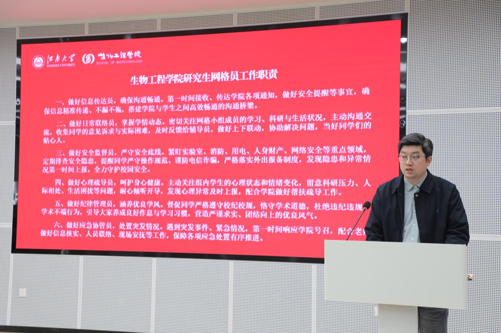 为健全研究生精细化管理服务体系,打通育人工作“最后一公里”,筑牢校园安全防线,切实提升研究生管理服务质量,4月3日上午,生物工程学院研究生网格化管理启动仪式暨网格员聘任仪式在江南大学国工二楼学术报告厅举行。学院党委副书记、副院长林丹,副院长陈晟,全体研究生辅导员及全体研究生网格员参加仪式。仪式由学院学工办主任周春江主持。