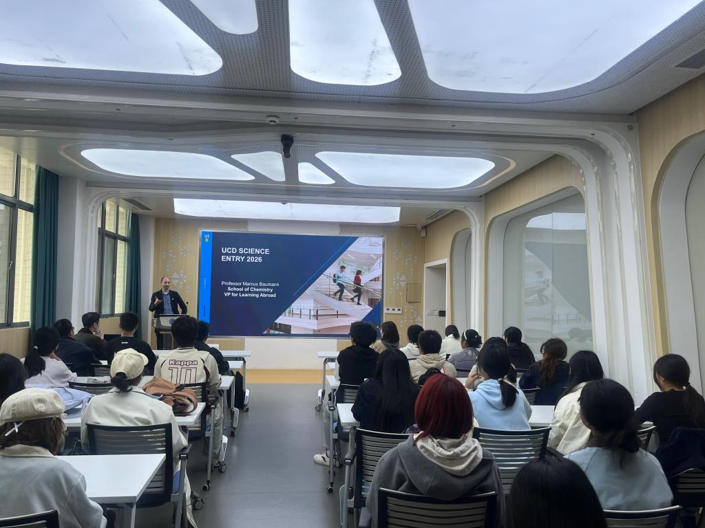 宣讲环节中,Marcus Baumann教授详细介绍了都柏林大学理学部与工程学部的学科设置、科研方向与教学资源。Edar Yu副总监从地理区位、经济地位与教育实力等方面阐述了爱尔兰的整体情况,重点解读了都柏林大学的学科优势、办学实力,以及“3+1+1”等联合培养模式的申报条件、申请流程与奖学金政策。