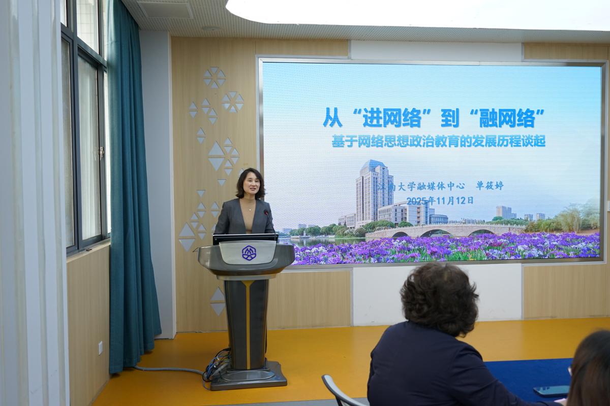 首先,单筱婷以“从‘进网络’到‘融网络’”为题,强调了习近平总书记关于网络强国的重要思想,讲述了网络思想政治教育的发展历程,并就数据化启蒙引领社交化共振、移动泛在化驱动矩阵化同频、借力数智化赋能构建网络思政生态体系等相关内容进行了交流分享。
