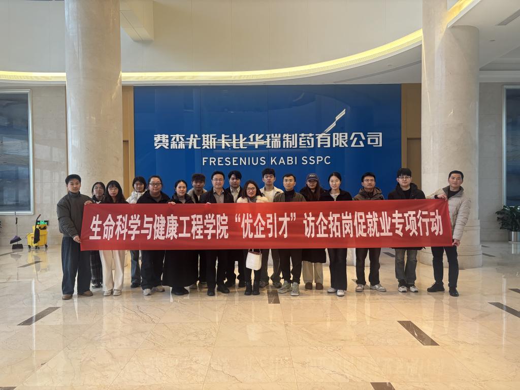 为深入贯彻落实教育部“优企引才”定向访企拓岗促就业专项行动,精准对接生物医药企业人才需求,1月26日下午,生命科学与健康工程学院党委副书记、副院长孙颖带队赴费森尤斯卡比华瑞制药有限公司开展“优企引才”访企拓岗促就业专项行动。学院制药工程专业常务副主任林佩、副教授苏畅、辅导员苗文建、陆鞭君、张世祺、江南大学无锡医学院辅导员杨宇以及本研学生代表参与此次活动。