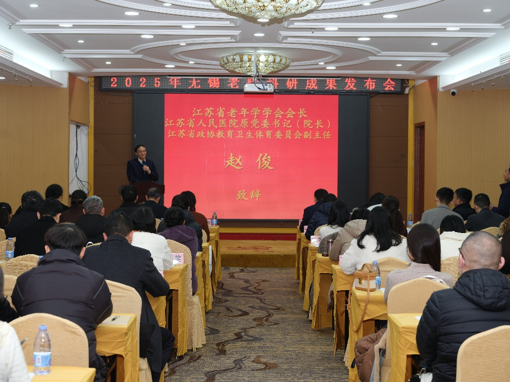 江苏省老年学学会会长、江苏省人民医院原党委书记、江苏省政协教育卫生体育委员会副主任赵俊发表致辞。他代表江苏省老年学学会向成果发布单位及获奖代表表示热烈祝贺,并向所有关心支持老年学研究的社会各界人士致以衷心感谢。赵俊在致辞中充分肯定了无锡市围绕新时代老年人多样化服务需求所开展的各项工作,包括调查研究、医养融合推进、优待服务拓展、老年教育发展、银龄行动实施以及老年文化培育等多项实践。他期待无锡未来继续发挥示范引领作用,为“十五五”时期老龄事业高质量发展贡献更多智慧与力量。