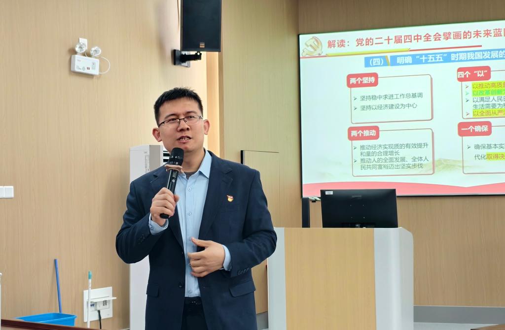会上,江南大学马克思主义学院副教授、硕士生导师巩建青老师作《擘画新蓝图 奋进新征程——学习贯彻党的二十届四中全会精神》专题宣讲。他紧扣五大核心维度层层递进、逐步深入:其一是解读党的二十届四中全会的核心内涵,具有锚定“十五五”、奠基“现代化”的战略意义。其二是剖析党中央高度重视“十五五”规划编制的核心逻辑与战略考量。其三是回顾“十四五”时期,我国在经济社会发展、科技创新、民生保障等领域取得的历史性成就与突破性进展。其四是讲解党的二十届四中全会生动擘画的未来蓝图,认识到社会主义现代化是一个阶梯式递进、不断发展进步的历史过程,需要全社会不懈努力、接续奋斗。最后是对贯彻落实党的二十届四中全会精神的实践路径进行生动阐释,进一步夯实教职工立足岗位、干事创业的责任与担当。