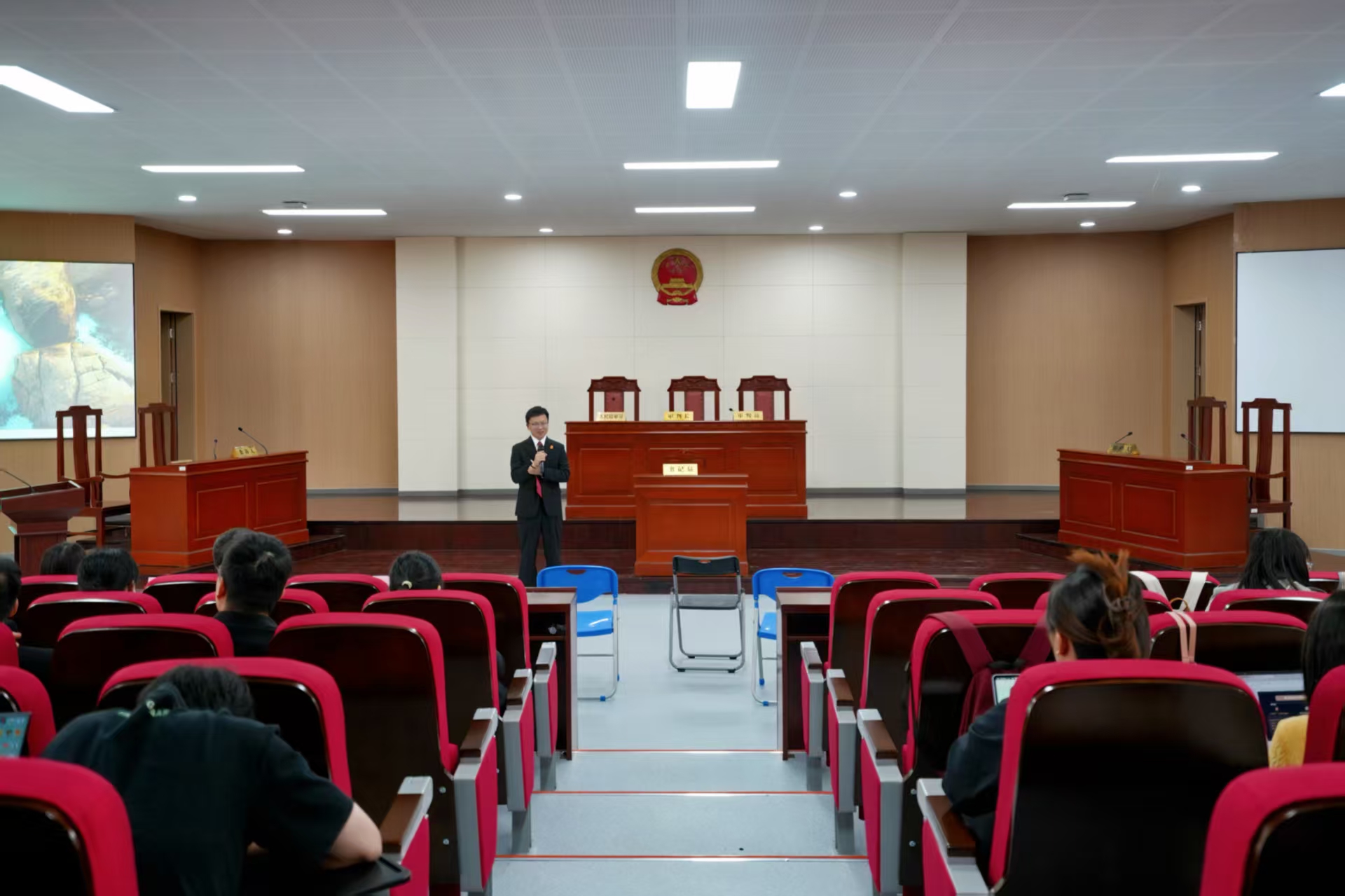 此次庭审是一起关于青少年和老年人的意外伤害民事诉讼,是面向学生群体公开开庭的案件。案件围绕原告陈某与被告周某等生命权、身体权、健康权纠纷展开,涉及青少年与老年人在日常生活中的意外伤害责任认定问题。庭审按照民事诉讼程序进行,法庭调查、举证质证、法庭辩论等环节规范有序,旁听的法学院师生全程沉浸式观摩,直观感受到庭审的庄重严肃与程序正义。庭审结束后,曹道清结合案情,就证据采信、责任划分、法律适用等实务问题与学生展开互动讨论,梅锦则从理论教学层面进行讲授,就侵权法的疑难问题、裁判思维与学术观点等进行分享。现场学生踊跃提问,互动氛围热烈。
