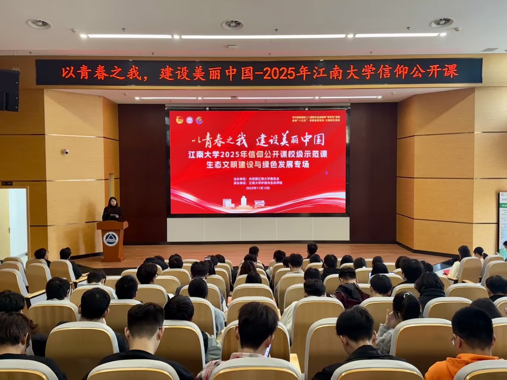 公开课主体环节采用“实践案例+志愿故事+理论阐释”的三维宣讲模式,三位嘉宾带来精彩分享。江南大学环境与生态学院校友张福鑫以《厨余垃圾管理探索与ESG管理》为题,结合自身参与的城市厨余垃圾处理项目,从技术研发、成本控制、政策适配三个维度,解析了“变废为宝”的环保产业路径,强调青年学生应兼具专业素养与社会责任。环境与生态学院团委副书记、2023级硕士研究生沈凯分享了“绿碳方舟”生态科普志愿服务项目经验,通过“中小学环保课堂”“社区垃圾分类督导”等鲜活案例,展现了青年学子用脚步传播绿色理念的担当。马鼋学会青年理论宣讲员、马克思主义学院2025级硕士研究生潘美琪以《深学笃行习近平生态文明思想,挺膺担当建设美丽中国》为题,阐释了“绿水青山就是金山银山”理念的实践伟力,引导同学们将个人发展融入生态强国建设大局。