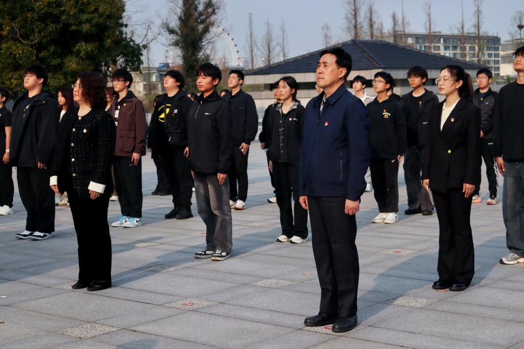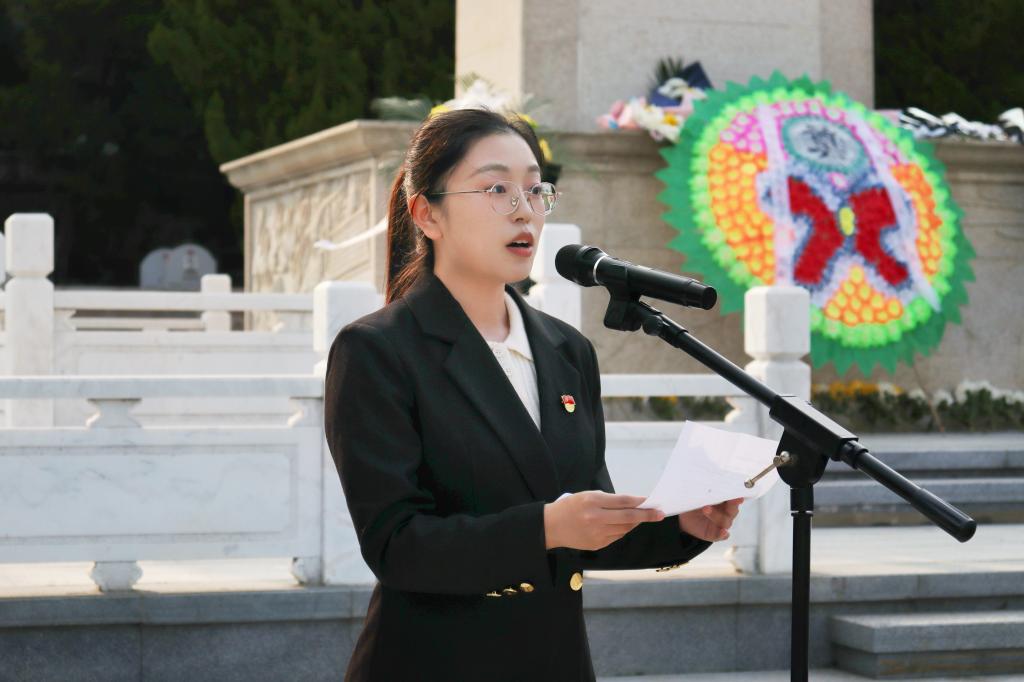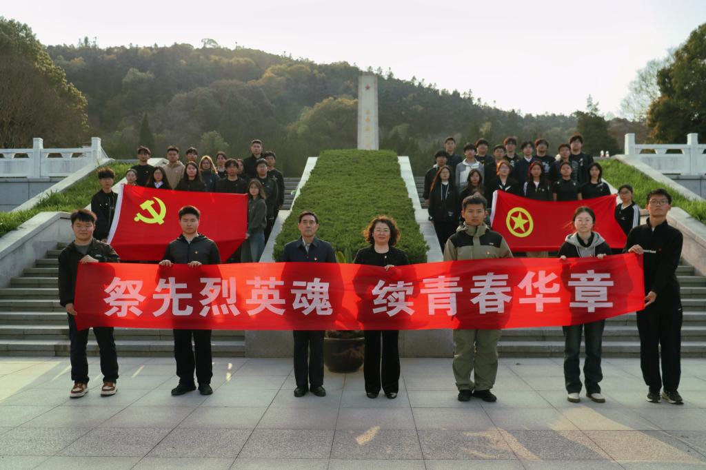 随后,全体肃立齐唱国歌,激昂歌声回荡陵园上空,彰显青年赤诚。学生代表缓步上前,向纪念碑敬献花圈;全体人员三鞠躬,以庄重仪式缅怀英烈、致敬忠魂。仪式上,本科生党员代表白珊珊、团员代表王俊力先后发言。白珊珊号召党员以先烈为榜样,将初心融入专业学习;王俊力承诺青年将传承革命精神,以实干担当书写青春答卷。