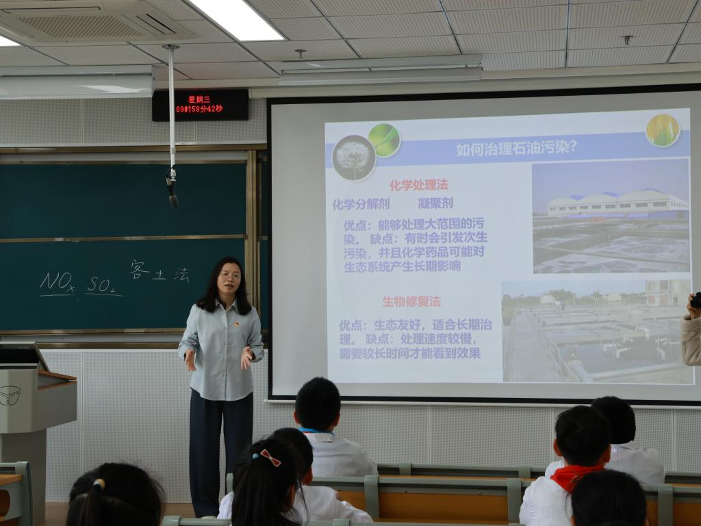 4月1日上午,以“生态科普润童心,绿色理念伴成长”为主题的小学生研学活动率先开启。环境与生态学院副教授郁红艳担任指导老师,为宜兴小学生们量身打造趣味科普内容。郁红艳以《了解石油污染与治理》为题展开宣讲,结合孩子们的认知特点,用通俗的语言、鲜活的案例讲解石油污染的危害与治理技术,从自然生态保护延伸到日常环保小事,层层引导孩子们树立环保意识。宣讲现场,孩子们踊跃提问、积极互动,对生态知识的好奇与探索溢于言表。随后的“凝”净江南——探秘“污水变清”的魔法动手实验环节,学院志愿者全程指导,孩子们分组协作操作实验器材,亲眼见证浑浊污水在药剂添加、沉淀过滤等步骤后逐渐变清的神奇过程,在亲手实践中直观理解污水处理基本原理,感受科技治污的独特魅力。