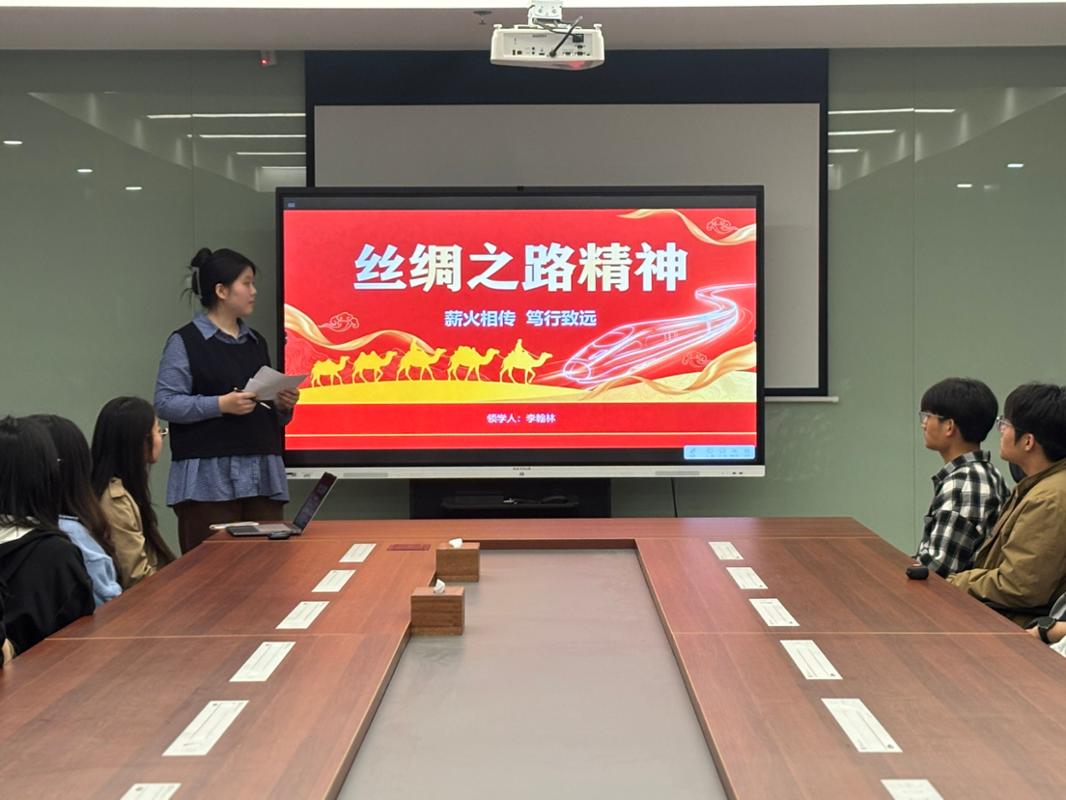 活动伊始,党支部成员李翰林以“学习丝路精神开放包容、互学互鉴的理念”为主题进行领学。她从古丝绸之路的历史渊源出发,系统解读了丝路精神“和平合作、开放包容、互学互鉴、互利共赢”的核心内涵,并结合当代全球化背景,阐述了青年一代树立文化自信、践行人类命运共同体意识的重要意义。此外,李翰林还立足专业,提出环境学子应积极投身绿色丝绸之路建设,在跨境生态治理、绿色低碳技术创新、可持续发展合作中贡献青年智慧。
