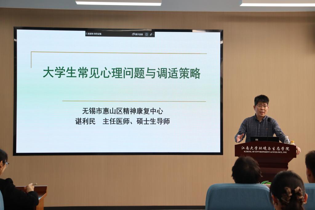 为深入推进“五育润心”心理育人体系建设,落实大学生心理健康教育工作要求,帮助学生科学识别心理困扰、掌握调适方法与应对策略,4月17日下午,江南大学环境与生态学院在蠡湖校区学院楼216会议室举办“杏坛听语”暨“E路境心”心理工作室系列讲座。本次讲座特邀无锡市惠山区精神康复中心主任医师、硕士生导师谌利民教授主讲,学院师生通过线下参与、线上同步直播的方式共同聆听了本次讲座,讲座由学院研究生辅导员周期主持。