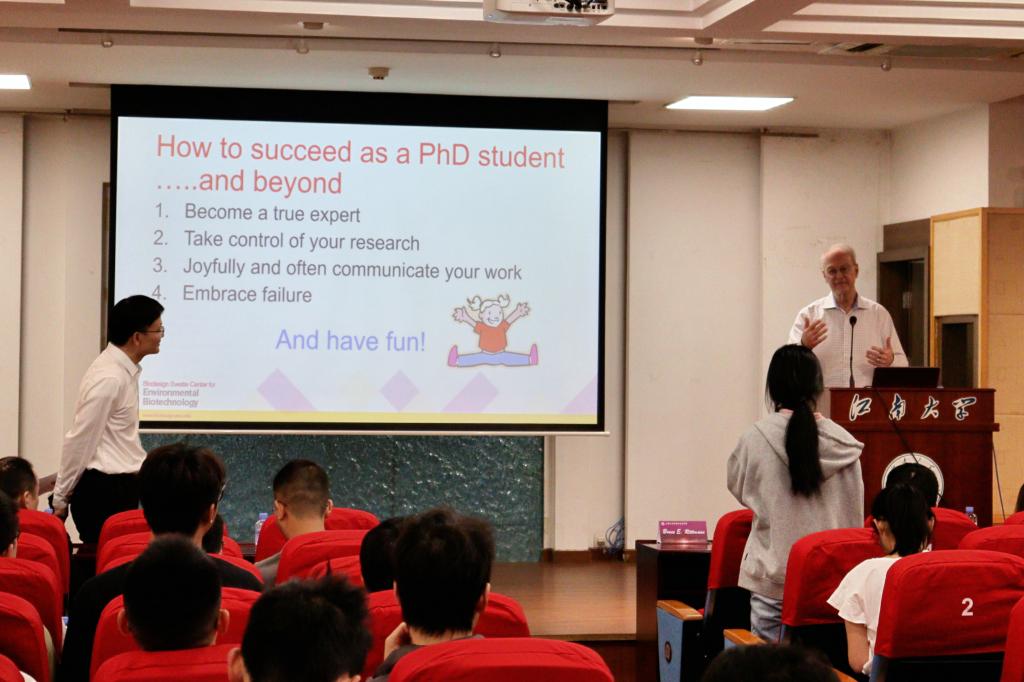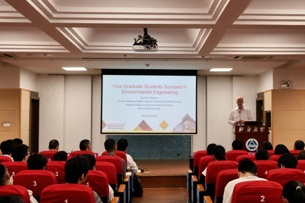 4月27日,应江南大学环境与生态学院邀请,美国国家工程院院士、亚利桑那州立大学 Bruce E. Rittmann 教授做客学院“金山-环境大讲堂”,在文浩馆205报告厅作题为How PhD Students Succeed in Environmental Engineering的学术报告。讲座由学院院长何锋教授主持,学院师生代表到场聆听交流。