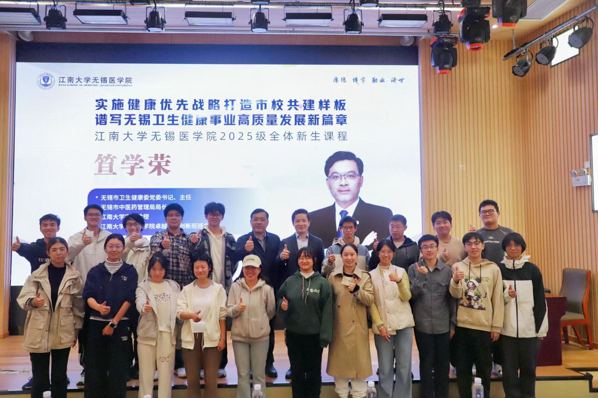 笪学荣结合无锡卫生健康事业发展实践,深入解析医学、卫生、健康三者内在逻辑关联,让新生直观理解医学专业的核心价值与使命担当。他指出,无锡卫生健康事业立足从“资源扩容”向“全面升级”跨越,从“合作共建”向“深度融合”迈进,从“以治病为中心”向“以人民健康为中心”转变,在健康城市示范、惠民服务创新、科技人才赋能等领域形成特色“无锡经验”,为医学生提供了广阔的实践舞台与发展空间。