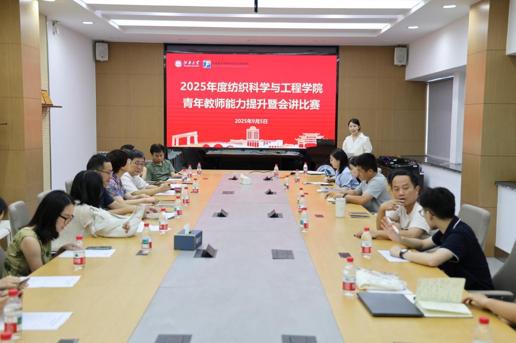 9月5日下午,纺织科学与工程学院2025年度青年教师能力提升暨会讲比赛在学院A306会议室成功举办。本次活动既是学院迎接教师节的重要教学实践活动,更是助力青年教师提升教学能力、以赛促教的重要平台。学院党委书记张菁燕、轻化工程系主任殷允杰莅临指导,王树根教授、徐阳教授、王平教授、袁久刚教授、李蔚副教授担任评委,关玉、贺海军、李大伟、孟超然、周曼五位青年教师同台竞技,学院38岁以下青年教师到场观摩参会。