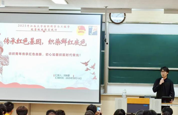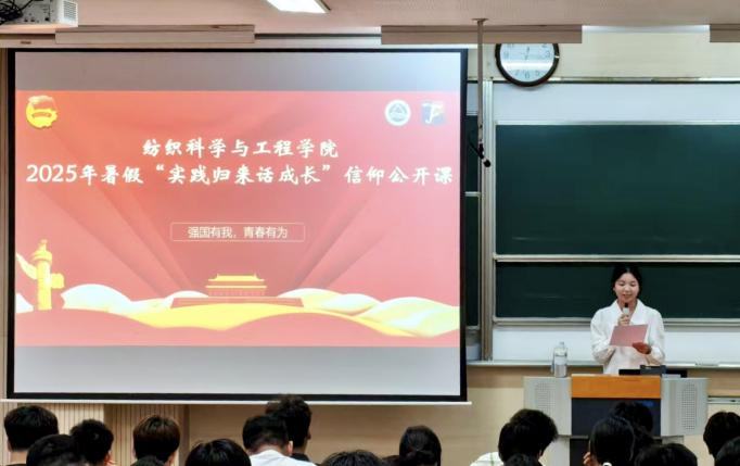 10月13日晚,纺织科学与工程学院于第一教学楼1B103举办2025年暑假“实践归来话成长”信仰公开课。2025级本科生辅导员孙洲龙、2025年暑假社会实践各院级重点团队代表及2025级全体本科生参与此次活动,会议由学院学生会团委通讯社胡欣悦主持。