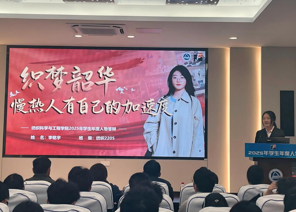 本次学生年度人物评选经自主申报、年级推荐、专家评审、先进事迹展示、现场答辩展示等环节,最终2022级学生组织主席团、李铭宇、肖楚橦、龙治雯、薛仝获得“纺织科学与工程学院2025年学生年度人物”荣誉称号;姜雨萌、刘芯婷、叶姝含、蒋鑫、陶艺、余嘉慧、张航、左子康、纺织2202班获得“纺织科学与工程学院2025年学生年度人物提名奖”荣誉称号。